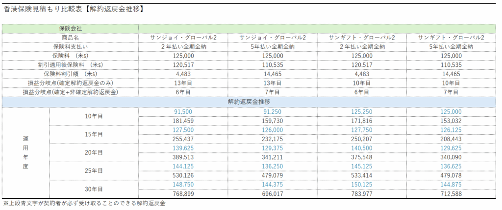 加入保険料を保険料総額125,000$に揃え、2年・5年払いの全期全納で割引を適用しサンジョイ・ギフトグローバルⅡに加入した場合の割引額と解約返戻金をまとめた資料を添付しておく。
