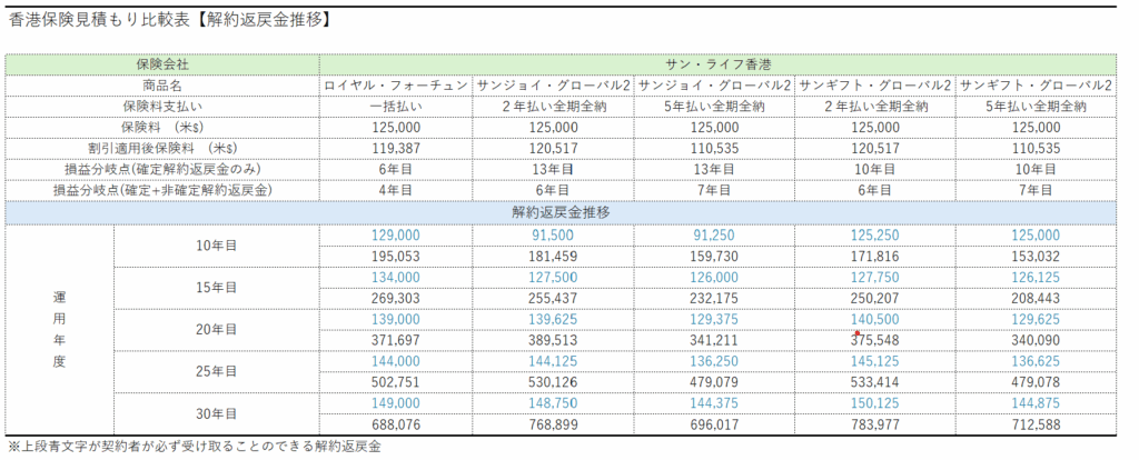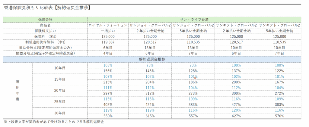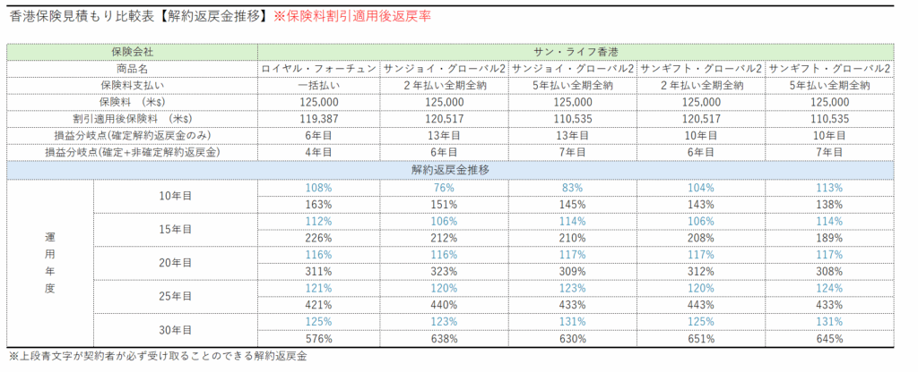 非確定解約返戻金の将来の伸びに期待し加入の意思決定をして頂くのも良いが、サンジョイ・ギフトに限らず香港保険を活用した資産運用であり資産形成の真骨頂は約束されたリターンを契約者の方達へお支払いするところにある。ご自身で株の売買をする自信がない方や、日本で販売される保険商品の運用利回りではどことなく心もとなく感じておられる方達のツボを程よく押してくれるのが香港保険でありその約束された確定解約返戻金だ。なので私は必ず新商品が販売されたり今回のように既存商品の運用利回りが変わる際には、必ず確定解約返戻金の増え方だけは特に注意して確認するようにしている。
