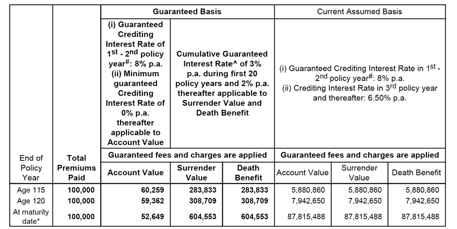 側のボックス(Guaranteed Basis/確定ベース)を参照していただきたい。Age120の箇所には59,362ドルと記載がある。これが契約者のアカウント価値で、その隣の308,709ドルが解約返戻金と死亡保障である。確定ベースなので、もし契約者が名義変更をせず120歳で解約、または亡くなった場合、この金額を被保険者または受益者が受け取ることができる。一番下の「At Maturity date」は、運途中に引出しなどを一切せず、名義変更をしながら120年運用した場合の数値である。