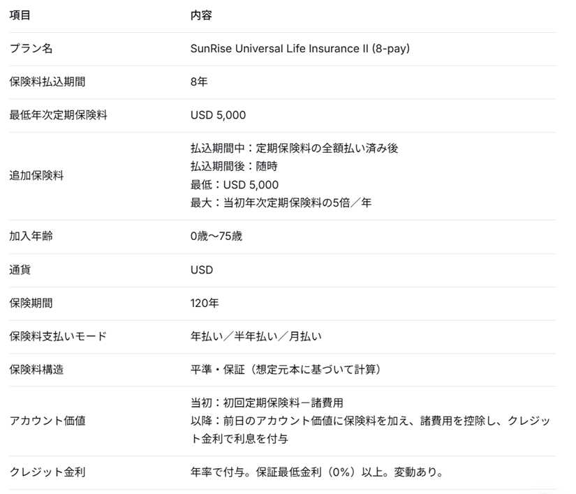 サンライズ2は、8年払いまたは全期前納(一括払い)のいずれかでの加入となる。追加投資が行えるのは保険料を支払い終えた後で、最大で年間5回の追加投資が可能だ。1回当たりの最低投資額は5,000ドルからとなる。追加保険料手数料が4%かかるため、仮に1万ドルを追加する場合、手数料を差し引いた9,600ドルが契約者のアカウントに入金され、運用の原資となる。