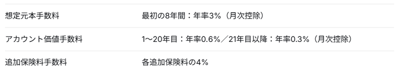 以下に商品情報や手数料をまとめているが、これらの条件はすべて見積もりに反映されている。また解約返戻金や死亡保障は、途中引出しや保険料の一時停止・遅延がない前提の数値である。