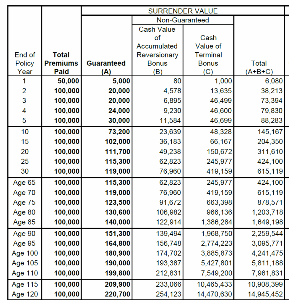 これら非確定解約返戻金の運用成績は毎年保険会社からフルフィルメントレシオとして達成率が公表される。添付した見積もりを例に取ってみる。契約後15年目、ラインを見てもらいたい。(B)リバーショナリーボーナス解約返戻金は36,183$、(C)ターミナルボーナスは66,167$となっている。もし仮に達成率がそれぞれ100%だった場合、36,183$のリバーショナリーボーナスは非確定解約返戻金のから確定解約返戻金に変わり契約者の口座に蓄積される。一方の66,167$ターミナルボーナスだが、達成率が100%だったとしても確定解約返戻金に変わることはない。あくまでその年の運用成績を確認するためのものとなる。このターミナルボーナスについて、少し味方を変えると、この年の運用達成率とその時点での解約返戻金の額、ここでは66,167$が契約者として満足のいくものであれば、その時点で解約の動機とすればよい。
