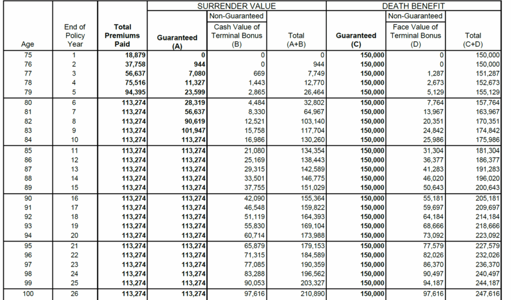 ここに74歳男性が18,879$/年間保険料を6年払いで総額113,274$を払い込み加入をした場合の見積もりがある。受け取れる死亡保障額は150,000$。日本円換算(1$=154円)で保険料が年間290万円。死亡保障額はおよそ2,300万円になる。